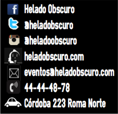 R: Si, mira sobre los eventos hacemos bodas, fiestas privadas, graduaciones, XV años, bautizos, hasta cubrimos conciertos, festivales y carnavales. Depende del tamaño del evento te cotizamos, nos puedes escribir a eventos@heladobscuro.com con una sola “o” heladobscuro , el teléfono de la heladería es 44-44-48-78 y para que vengan a conocernos estamos en Córdoba 223 entre Coahuila y Chiapas en la Col. Roma Norte.